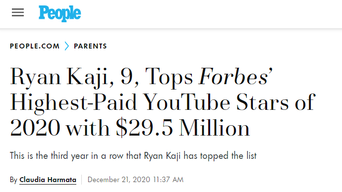 這不,最近《福布斯》就公佈了2020年收入最高YouTube主播的排行榜: