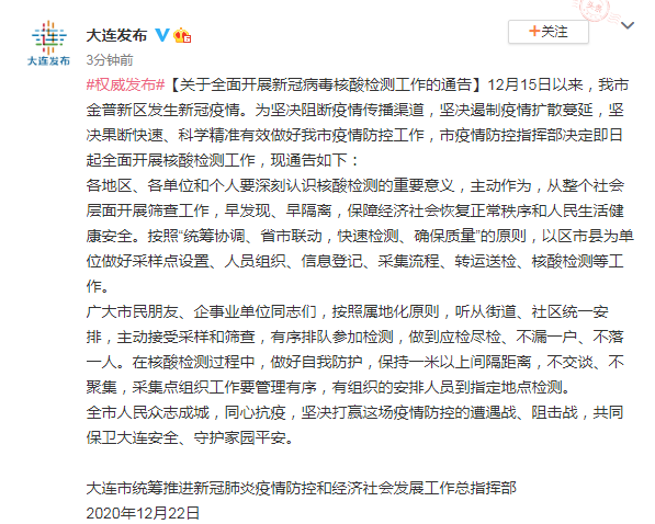 據@大連發布 消息:12月15日以來,我市金普新區發生新冠疫情。為堅決阻斷疫情傳播渠道,堅決遏制疫情擴散蔓延,堅決果斷快速、科學精準有效做好我市疫情防控工作,市疫情防控指揮部決定即日起全面開展核酸檢測工作,現通告如下: