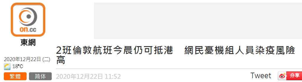 【環球網綜合報道 記者趙友平】港媒12月22日消息稱,港府今天(22日)凌晨起禁止英國航班抵港,以防止英國新冠肺炎變種病毒株在港擴散,但有兩班由倫敦來港的航班今晨仍飛抵香港。