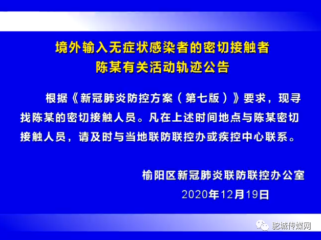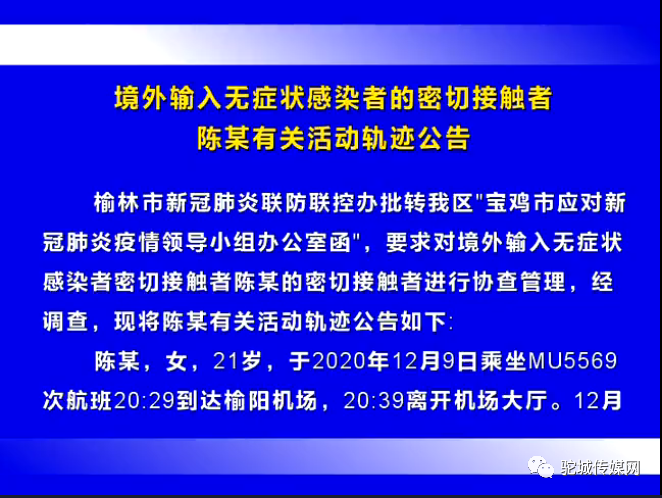榆林市新冠肺炎聯防聯控辦批轉我區“寶雞市應對新冠肺炎疫情領導小組辦公室函",要求對境外輸入無症狀感染者密切接觸者陳某 的密切接觸者進行協查管理, 經調查,現將陳某有關活動軌跡公告如下: