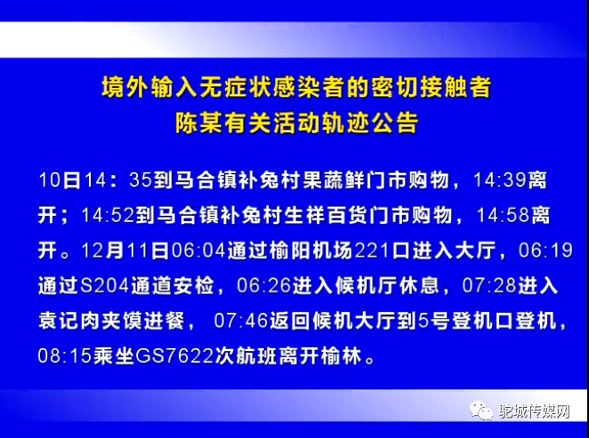 陳某,女,21歲,於2020年12月9日乘坐MU5569次航班20:29到達榆陽機場,20:39離開機場大廳。12月10日14:35到馬合鎮補兔村果蔬鮮門市購物,14:39離開;14:52到馬合鎮補兔村生祥百貨門市購物,14:58離開。12月11日06:04通過榆陽機場221口進入大廳,06:19通過S204通道安檢,06:26進入候機廳休息,07:28進入袁記肉夾饃進餐,07:46返回候機大廳到5號登機口登機,08:15乘坐GS7622次航班離開榆林。
