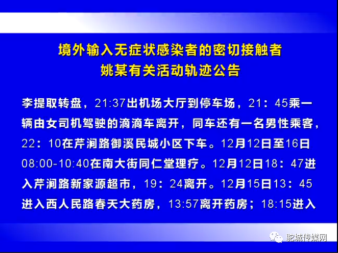 姚某,男,45歲,於2020年12月9日乘坐BK2905次航班(座位號12C)21:26到達榆陽機場,21:32到行李提取轉盤,21:37出機場大廳到停車場,21:45乘一輛由女司機駕駛的滴滴車離開,同車還有一名男性乘客,22:10在芹澗路御溪民城小區下車。12月12日至16日08:00-10:40在南大街同仁堂理療。12月12日18:47進入芹澗路新家源超市,19:24離開。12月15日13:45進入西人民路春天大藥房,13:57離開藥房;18:15進入芹澗路福利彩票店,18:20離店;18:24進入芹澗路糧油蔬菜門市,18:27離店。12月16日10:24來到星元醫院預檢分診處,10:25進入門診大廳,10:33核酸檢測點採樣,10:40離開醫院。