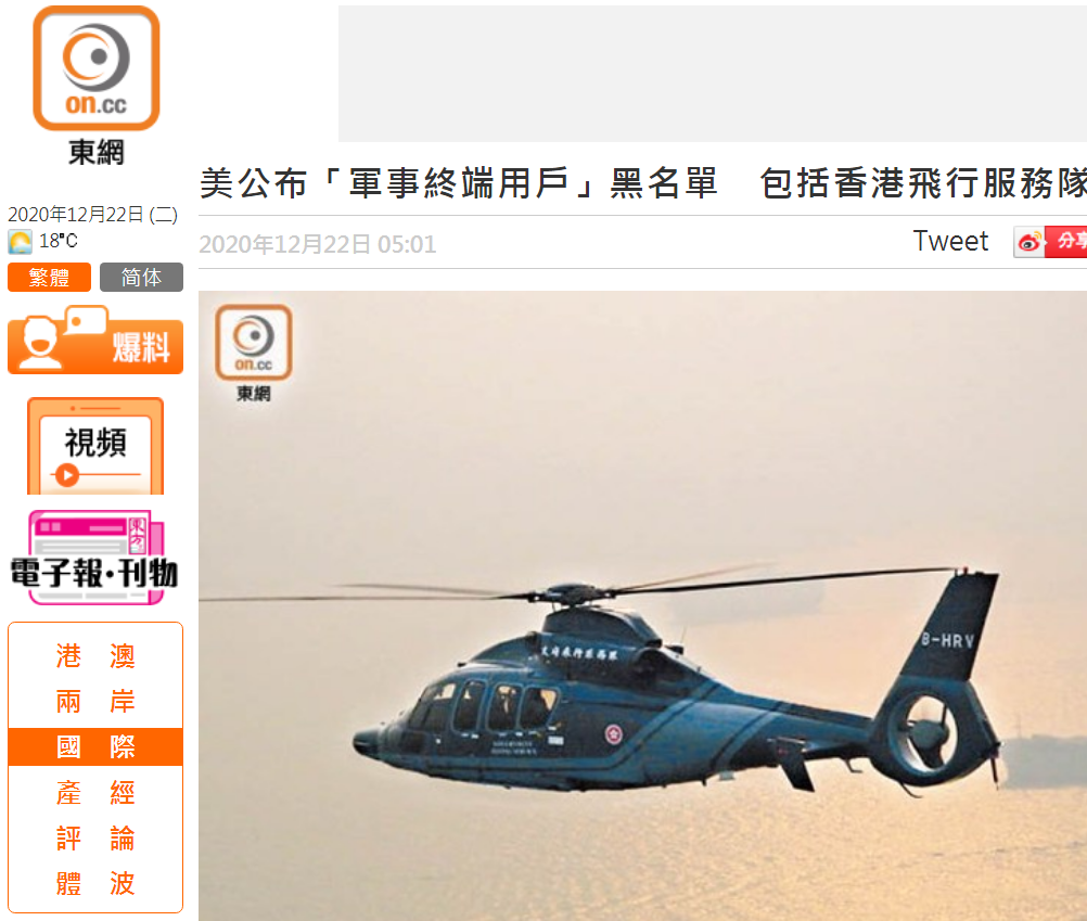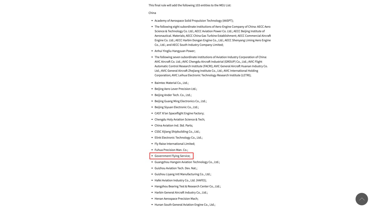 據路透社消息,當地時間21日,美國商務部公佈了一份所謂“與軍方有關聯”的中國、俄羅斯實體清單,並將限制其購買一系列美國商品和技術。這份清單提到了103個實體,其中包括45家俄羅斯實體和58家中國實體。據香港“東網”12月22日消息,這份清單中也包括香港飛行服務隊。