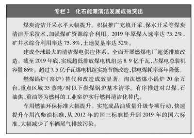 中國把推進能源綠色發展作為促進生態文明建設的重要舉措,堅決打好污染防治攻堅戰、打贏藍天保衞戰。煤炭清潔開採和利用水平大幅提升,採煤沉陷區治理、綠色礦山建設取得顯著成效。落實修訂後的《大氣污染防治法》,加大燃煤和其他能源污染防治力度。推動國家大氣污染防治重點區域內新建、改建、擴建用煤項目實施煤炭等量或減量替代。能源綠色發展顯著推動空氣質量改善,二氧化硫、氮氧化物和煙塵排放量大幅下降。能源綠色發展對碳排放強度下降起到重要作用,2019年碳排放強度比2005年下降48.1%,超過了2020年碳排放強度比2005年下降40%—45%的目標,扭轉了二氧化碳排放快速增長的局面。(見專欄2)
