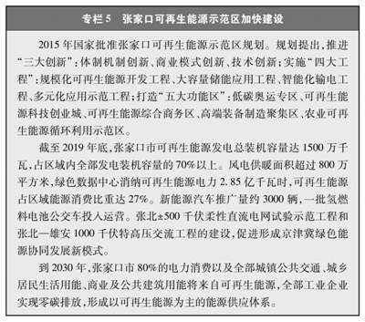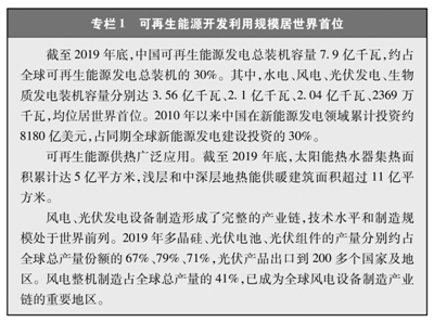 全面提升可再生能源利用率。完善可再生能源發電全額保障性收購制度。實施清潔能源消納行動計劃,多措並舉促進清潔能源利用。提高電力規劃整體協調性,優化電源結構和佈局,充分發揮市場調節功能,形成有利於可再生能源利用的體制機制,全面提升電力系統靈活性和調節能力。實行可再生能源電力消納保障機制,對各省、自治區、直轄市行政區域按年度確定電力消費中可再生能源應達到的最低比重指標,要求電力銷售企業和電力用户共同履行可再生能源電力消納責任。發揮電網優化資源配置平台作用,促進源網荷儲互動協調,完善可再生能源電力消納考核和監管機制。可再生能源電力利用率顯著提升,2019年全國平均風電利用率達96%、光伏發電利用率達98%、主要流域水能利用率達96%。(見專欄5)