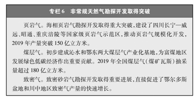 提高天然氣生產能力。加強基礎地質調查和資源評價,加強科技創新、產業扶持,促進常規天然氣增產,重點突破頁岩氣、煤層氣等非常規天然氣勘探開發,推動頁岩氣規模化開發,增加國內天然氣供應。完善非常規天然氣產業政策體系,促進頁岩氣、煤層氣開發利用。以四川盆地、鄂爾多斯盆地、塔里木盆地為重點,建成多個百億立方米級天然氣生產基地。2017年以來,每年新增天然氣產量超過100億立方米。(見專欄6)