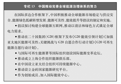 倡導區域能源合作。搭建中國與東盟、阿盟、非盟、中東歐等區域能源合作平台,建立東亞峯會清潔能源論壇,中國推動能力建設與技術創新合作,為18個國家提供了清潔能源利用、能效等領域的培訓。(見專欄13)