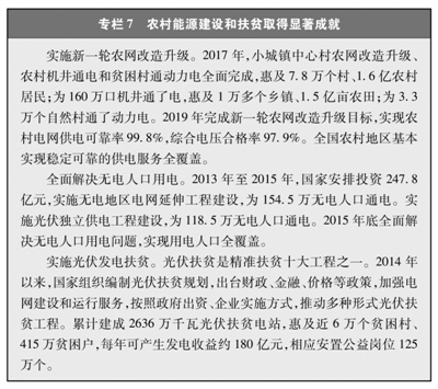加快完善農村能源基礎設施。讓所有人都能用上電,是全面建成小康社會的基本條件。實施全面解決無電人口問題三年行動計劃,2015年底全面解決了無電人口用電問題。中國高度重視農村電網改造升級,着力補齊農村電網發展短板。實施小城鎮中心村農網改造升級、平原農村地區機井通電和貧困村通動力電專項工程。2018年起,重點推進深度貧困地區和抵邊村寨農網改造升級攻堅。加快天然氣支線管網和基礎設施建設,擴大管網覆蓋範圍。在天然氣管網未覆蓋的地區推進液化天然氣、壓縮天然氣、液化石油氣供應網點建設,因地制宜開發利用可再生能源,改善農村供能條件。