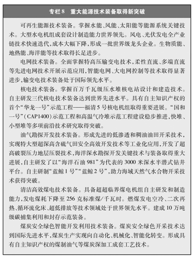 持續推進能源科技創新,能源技術水平不斷提高,技術進步成為推動能源發展動力變革的基本力量。建立完備的水電、核電、風電、太陽能發電等清潔能源裝備製造產業鏈,成功研發製造全球最大單機容量100萬千瓦水電機組,具備最大單機容量達10兆瓦的全系列風電機組製造能力,不斷刷新光伏電池轉換效率世界紀錄。建成若干應用先進三代技術的核電站,新一代核電、小型堆等多項核能利用技術取得明顯突破。油氣勘探開發技術能力持續提高,低滲原油及稠油高效開發、新一代複合化學驅等技術世界領先,頁岩油氣勘探開發技術和裝備水平大幅提升,天然氣水合物試採取得成功。發展煤炭綠色高效智能開採技術,大型煤礦採煤機械化程度達98%,掌握煤制油氣產業化技術。建成規模最大、安全可靠、全球領先的電網,供電可靠性位居世界前列。“互聯網+”智慧能源、儲能、區塊鏈、綜合能源服務等一大批能源新技術、新模式、新業態正在蓬勃興起。