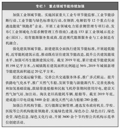 積極優化產業結構,大力發展低能耗的先進製造業、高新技術產業、現代服務業,推動傳統產業智能化、清潔化改造。推動工業綠色循環低碳轉型升級,全面實施綠色製造,建立健全節能監察執法和節能診斷服務機制,開展能效對標達標。提升新建建築節能標準,深化既有建築節能改造,優化建築用能結構。構建節能高效的綜合交通運輸體系,推進交通運輸用能清潔化,提高交通運輸工具能效水平。全面建設節約型公共機構,促進公共機構為全社會節能工作作出表率。構建市場導向的綠色技術創新體系,促進綠色技術研發、轉化與推廣。推廣國家重點節能低碳技術、工業節能技術裝備、交通運輸行業重點節能低碳技術等。推動全民節能,引導樹立勤儉節約的消費觀,倡導簡約適度、綠色低碳的生活方式,反對奢侈浪費和不合理消費。(見專欄3)