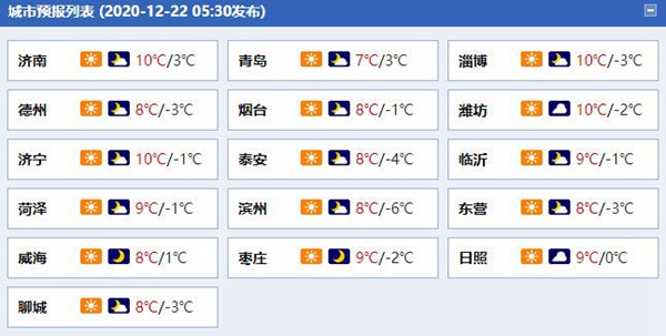 中國天氣網訊 未來三天(12月22日至24日),山東以晴到多雲天氣為主,魯西北、魯中等地最低氣温將跌至-7℃,寒意十足,公眾需及時添衣保暖,謹防感冒。