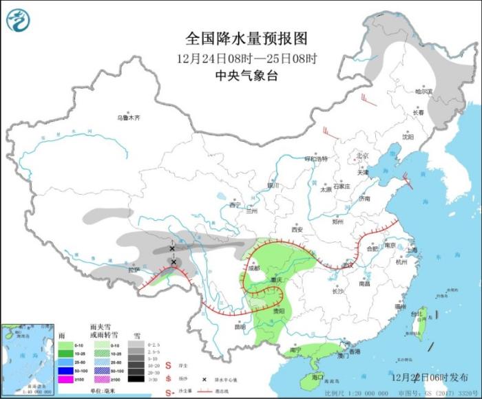 12月24日08時至25日08時,內蒙古東北部、東北地區中東部、西藏中東部、青海南部等地有小到中雪或雨夾雪。四川盆地中東部、重慶大部、貴州大部、雲南東部、廣西東南部、廣東西南部、海南島、台灣島等地部分地區有小雨。內蒙古中東部,山東半島東部等地有4~5級風(見圖3)。