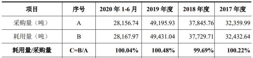但事實上,招股書第145頁披露的原材料耗用量數據顯示,2017年到2020年上半年分別為32432.64噸、37729.71噸、49431.04噸和28167.97噸,累計為14.78萬噸,相比同期鋁型材的生產量還少了0.53萬噸,這並不符合正常的生產邏輯。