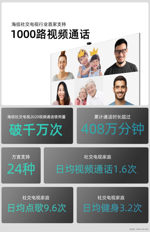 今年以來,支持線上視頻通話的社交電視正在不斷解鎖客廳應用場景,讓居家辦公、在線教育、健身娛樂的門檻都大幅度降低。海信最新發布的社交電視大數據顯示,截至2020年12月,海信社交電視視頻通話使用量破千萬次,累計通話時長超過408萬分鍾。