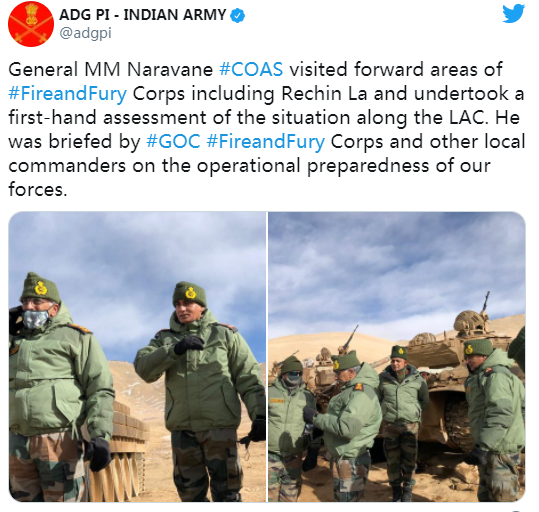 印度陸軍在推特上發文稱,納拉瓦內訪問了“火與怒”軍團(即印度陸軍第14軍團)的前沿地區,並對實際控制線(LAC)沿線局勢進行了“一手評估”。推文提到,納拉瓦內還聽取了當地指揮官關於印軍作戰準備的簡報。↓