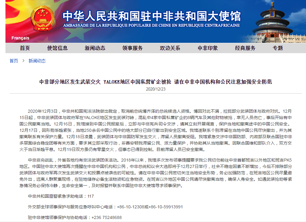 2020年12月3日,中非共和國憲法法院做出裁定,取消前總統博齊澤的總統候選人資格。博因對此不滿,拉攏部分武裝團體與政府對抗。12月15日起,中非武裝團體與政府軍在YALOKE地區發生武裝對峙,混亂中4家中國私營礦企的8輛汽車及其他財物被搶,幸無人員傷亡,事後開始有中國公民撤離當地。12月16日,我館接到中國公民報案後,立即與中非憲兵司令交涉,請其立刻開展調查,保護當地和撤離途中的中國公民安全。12月17日,因形勢漸趨緊張,當地250餘名中國公民中的絕大部分已自行撤出到安全區域。我館遂聯繫個別滯留在當地中國公民儘快撤出,併為其撤離聯繫有關保護力量。12月18日凌晨,武裝團體與中非國防軍發生交火,滯留人員撤離受阻。我館緊急交涉中非國防部、內政部及聯合國駐中非多層面綜合穩定團等有關方面,要求其立即採取行動,妥善安頓我滯留公民、派力量保護,並協助其從當地撤離。因聯合國維和部隊介入,雙方交火於當日漸趨平息。12月19日雙方雖仍有零星交火,但事態已得到控制。目前滯留人員已安全撤離。