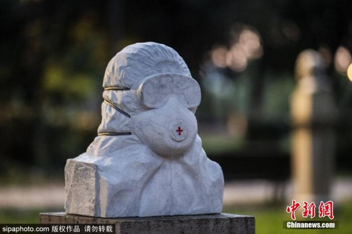資料圖:當地時間2020年11月6日,意大利,這尊大理石半身像在羅馬聖殿展出,描繪了一個戴着眼鏡、紅十字會口罩的人,上面寫着抗擊新冠肺炎的戰士。圖片來源:Sipaphoto版權作品 禁止轉載