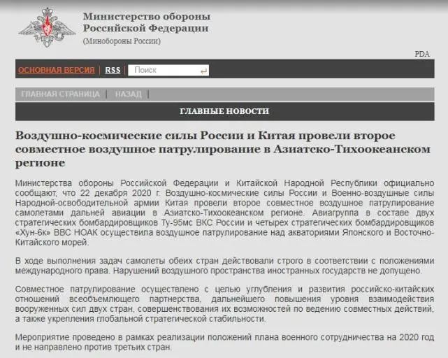 俄羅斯聯邦國防部和中華人民共和國國防部正式宣佈,2020年12月22日,俄羅斯空天軍和中國人民解放軍空軍在亞太地區舉行了第二次聯合空中巡航。俄空天軍2架圖-95MS戰略轟炸機與中國空軍4架轟-6戰略轟炸機組成的聯合編隊在日本海和東海上空進行了空中巡航。