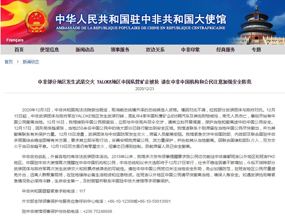 2020年12月3日,中非共和國憲法法院做出裁定,取消前總統博齊澤的總統候選人資格。博因對此不滿,拉攏部分武裝團體與政府對抗。12月15日起,中非武裝團體與政府軍在YALOKE地區發生武裝對峙,混亂中4家中國私營礦企的8輛汽車及其他財物被搶,幸無人員傷亡,事後開始有中國公民撤離當地。12月16日,我館接到中國公民報案後,立即與中非憲兵司令交涉,請其立刻開展調查,保護當地和撤離途中的中國公民安全。12月17日,因形勢漸趨緊張,當地250餘名中國公民中的絕大部分已自行撤出到安全區域。我館遂聯繫個別滯留在當地中國公民儘快撤出,併為其撤離聯繫有關保護力量。12月18日凌晨,武裝團體與中非國防軍發生交火,滯留人員撤離受阻。我館緊急交涉中非國防部、內政部及聯合國駐中非多層面綜合穩定團等有關方面,要求其立即採取行動,妥善安頓我滯留公民、派力量保護,並協助其從當地撤離。因聯合國維和部隊介入,雙方交火於當日漸趨平息。12月19日雙方雖仍有零星交火,但事態已得到控制。目前滯留人員已安全撤離。