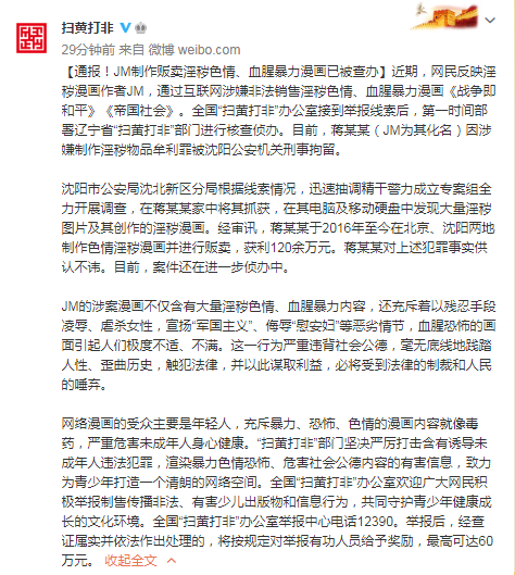 @掃黃打非12月23日消息,近期,網民反映淫穢漫畫作者JM,通過互聯網涉嫌非法銷售淫穢色情、血腥暴力漫畫《戰爭即和平》《帝國社會》。全國“掃黃打非”辦公室接到舉報線索後,第一時間部署遼寧省“掃黃打非”部門進行核查偵辦。目前,蔣某某(JM為其化名)因涉嫌製作淫穢物品牟利罪被瀋陽公安機關刑事拘留。