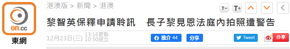【環球網綜合報道 記者趙友平】據港媒12月23日消息,亂港頭目、壹傳媒創辦人黎智英被單獨囚禁20天后,今天(23日)10點半由囚車押往香港高等法院申請保釋外出。法庭上,黎智英長子黎見恩舉起手機拍照,結果被保安警告,黎見恩立即刪除照片。