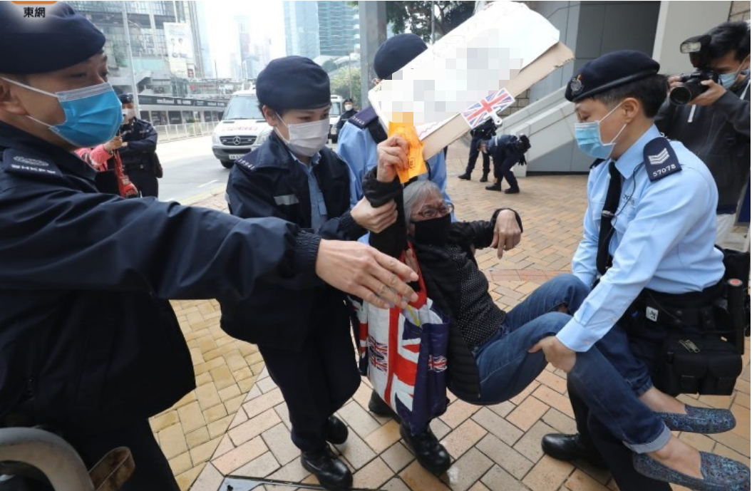 而在庭審前,之前多次持英國國旗出現“修例風波”現場、人稱“王婆婆”的王鳳瑤,早上9時許到香港高等法院外的囚車出入位置,聲稱要聲援黎智英,警方勸籲她離開不果後,最終由數名女警將她抬離。
