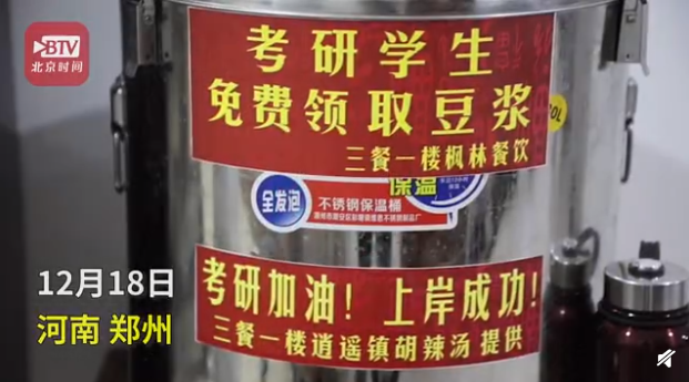 12月18日,鄭州工商學院為鼓勵考研學生好好備考,每天送熱豆漿給學生免費喝。