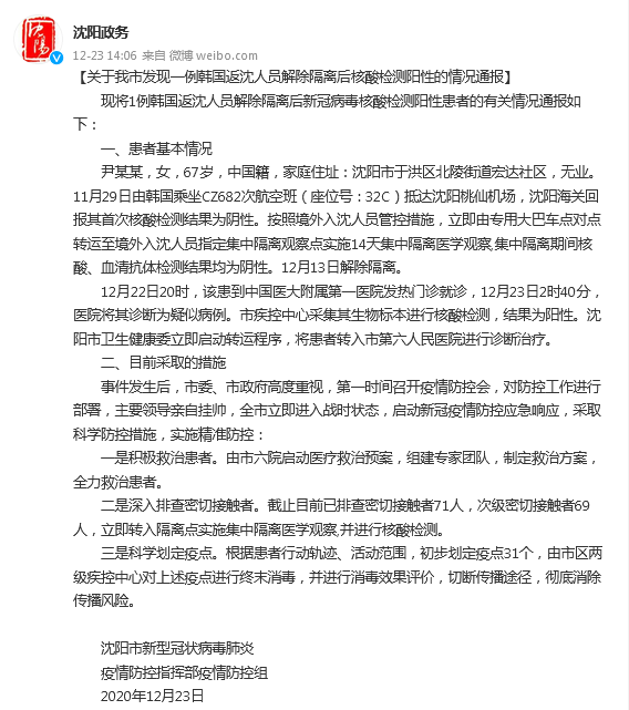 【關於我市發現一例韓國返沈人員解除隔離後核酸檢測陽性的情況通報】