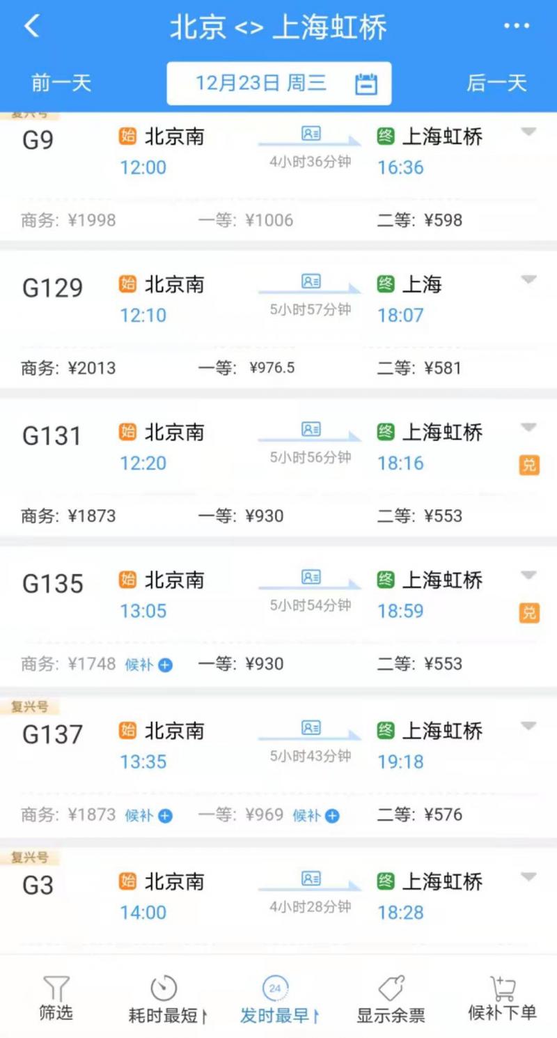 北青-北京頭條記者登錄鐵路12306查詢後發現,12月23日,北京南至上海虹橋站,二等座顯示最高票價為598元,最高票價的列車始發時間都為整點發車,分別為9點、10點、12點、14點、15點、17點、19點,它們全程運行時間是所有京滬高鐵中最快的,基本都在4個半小時左右。
