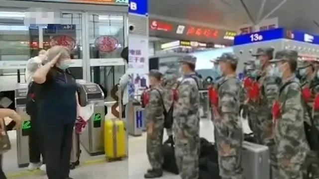 老教師情緒激動,囑託新兵們多多關照自己。希望他們保護好自己、保護好人民、保護好我們的國家,並敬禮向新兵們致敬。在場新兵也敬禮回敬老師。