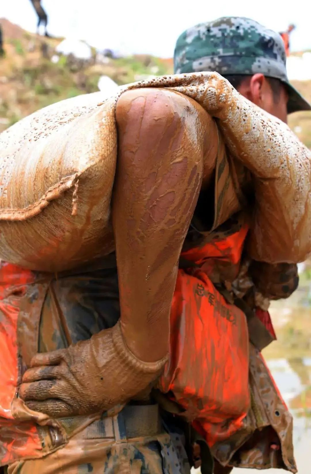 今年7月12日,武警第二機動總隊某支隊戰士武迎港與戰友們已經在大堤上奮戰了兩天兩夜。抬頭擦汗間,他看見一位雙鬢斑白的老奶奶,正挑着行李艱難行進在泥濘的路上。武迎港連忙放下手頭工作,徑直跑上前幫忙。