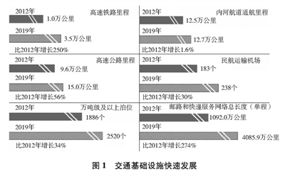 綜合交通基礎設施基本實現網絡化。截至2019年底,全國鐵路營業里程達到13.9萬公里,其中高速鐵路營業里程超過3.5萬公里;全國公路里程達到501.3萬公里,其中高速公路里程15萬公里;擁有生產性碼頭泊位2.3萬個,其中萬噸級及以上泊位數量2520個;內河航道通航里程12.7萬公里;民用航空頒證運輸機場238個;全國油氣長輸管道總里程達到15.6萬公里,互聯互通程度明顯加強;郵路和快遞服務網絡總長度(單程)4085.9萬公里,實現鄉鄉設所、村村通郵。綜合立體交通網絡初步形成,有力支撐了經濟社會持續快速健康發展。(見圖1)