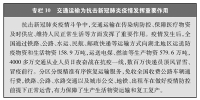 應對突發公共事件處置能力顯著提升。科學高效應對各類突發公共事件,健全工作體系,提升應急能力。新冠肺炎疫情發生後,中國果斷做出“一斷三不斷”(注7)部署,適時推出鐵路“七快速”(注8),公路“三不一優先”(注9),水運“四優先”(注10),民航客運“五個一”(注11)、貨運“運貿對接”(注12)以及郵政“綠色通道”等政策措施,一方面全力阻斷病毒通過交通工具傳播,另一方面保障全國各地應急物資運輸和人民生活需求,為打贏疫情防控人民戰爭、總體戰、阻擊戰提供了有力支撐。(見專欄10)