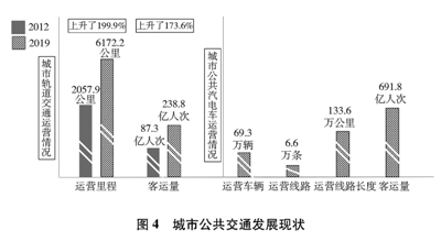 城市公共交通持續優先發展。發展公共交通是現代城市發展的方向,是加強城市交通治理、提升城市居民生活品質的有效措施。大力加強城市軌道交通建設,截至2019年底,全國共有40個城市開通運營城市軌道交通線路,運營里程達6172.2公里,城市軌道交通的骨幹作用日益凸顯,城市公交出行分擔率穩步提高,舒適度不斷提升。城市慢行交通系統較快發展,70餘個城市發佈共享單車管理實施細則,360餘個城市提供了共享單車服務。城市公共交通的發展為人們出行提供了便利,滿足了多樣化出行需求。(見圖4)(見專欄3)