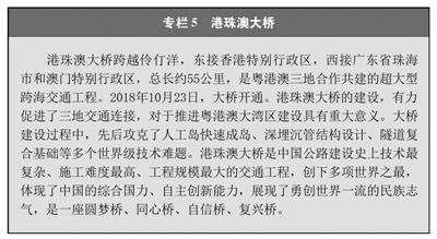 交通超級工程舉世矚目。高速鐵路、高寒鐵路、高原鐵路、重載鐵路技術達到世界領先水平,高原凍土、膨脹土、沙漠等特殊地質公路建設技術攻克世界級難題。離岸深水港建設關鍵技術、巨型河口航道整治技術、長河段航道系統治理技術以及大型機場工程建設技術世界領先。世界單條運營里程最長的京廣高鐵全線貫通,一次性建成里程最長的蘭新高鐵,世界首條高寒地區高鐵哈大高鐵開通運營,大秦重載鐵路年運量世界第一,世界上海拔最高的青海果洛藏族自治州雪山一號隧道通車。川藏鐵路雅安至林芝段開工建設。港珠澳大橋、西成高鐵秦嶺隧道羣、洋山港集裝箱碼頭、青島港全自動化集裝箱碼頭、長江口深水航道治理等系列重大工程舉世矚目。中國在建和在役公路橋樑、隧道總規模世界第一,世界主跨徑前十位的斜拉橋、懸索橋、跨海大橋,中國分別有7座、6座、6座,世界最高的10座大橋中有8座在中國。(見專欄5)