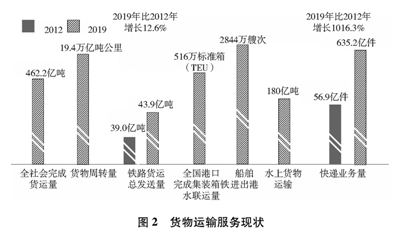 貨物運輸服務保障能力不斷提升。中國是世界上運輸最繁忙的國家。面對日益增長的貨物運輸需求,加快多式聯運發展,創新公鐵聯運、空鐵聯運、鐵水聯運、江海聯運、水水中轉、滾裝聯運等高效運輸組織模式,開展鐵路運能提升、水運系統升級、公路貨運治理等專項行動,貨物運輸結構持續優化,綜合運輸效率不斷提高,物流成本逐步降低,交通運輸環境污染明顯減少,原油、成品油、天然氣管道建設不斷提速。鐵路運量佔社會運輸總量比例不斷提升,“公轉鐵”行動取得突出成效。港口貨物吞吐量和集裝箱吞吐量均居世界第一。快遞業務量保持強勁增長態勢,連續6年位居世界第一。運輸服務能力大幅提升,推進物流降本增效取得積極成效,促進了物流業轉型升級。(見圖2)(見專欄2)