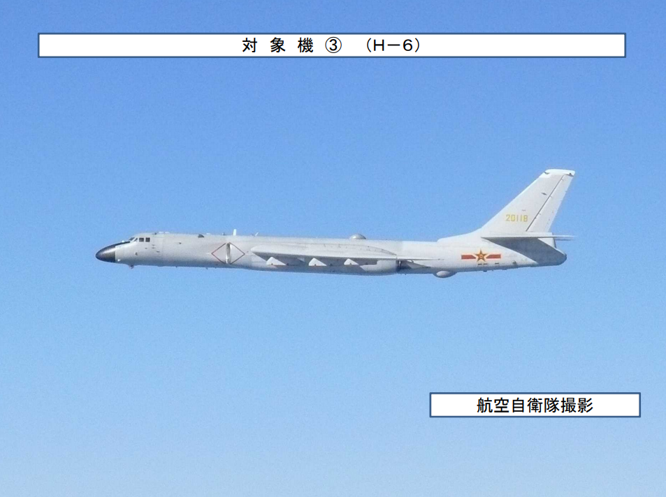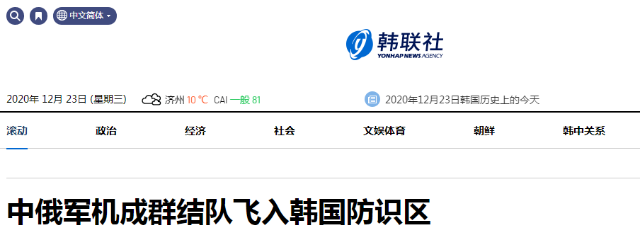 據韓聯社12月22日報道,韓國聯合參謀本部表示,當天有4架中國軍機和15架俄羅斯軍機一度飛入韓國防空識別區。韓國聯合參謀本部稱,當天上午8點多,4架疑似轟-6的中國解放軍飛機依次飛入蘇岩礁(韓稱離於島)以西的韓國防空識別區,其中2架經鬱陵島東部飛離韓國防識區。