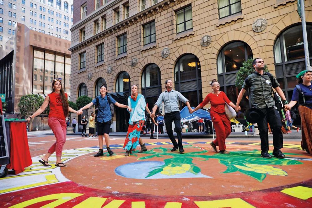 2019 年 9 月 25 日,在美國舊金山金融區蒙哥馬利街,人們在環保主題畫作上參加活動