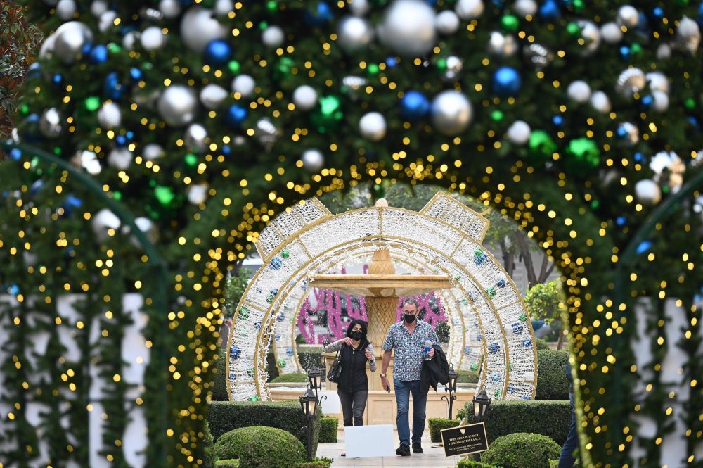 2020年11月23日,人們從美國洛杉磯貝弗利山的聖誕新年裝飾前走過。(新華社/法新)