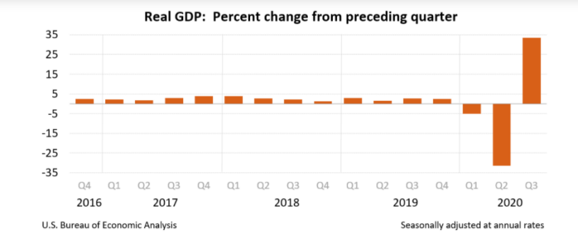 美國商務部12月22日公佈的修正數據顯示,今年第三季度美國GDP按年率計算增長33.4%,略高於此前初步數據顯示的33.1%,表明美國經濟在第三季度受到企業重新開工、消費者支出上升等短暫刺激出現大幅反彈。但即便反彈力度較大,美國第三季度實際GDP仍較疫情前的峯值低3.5%。