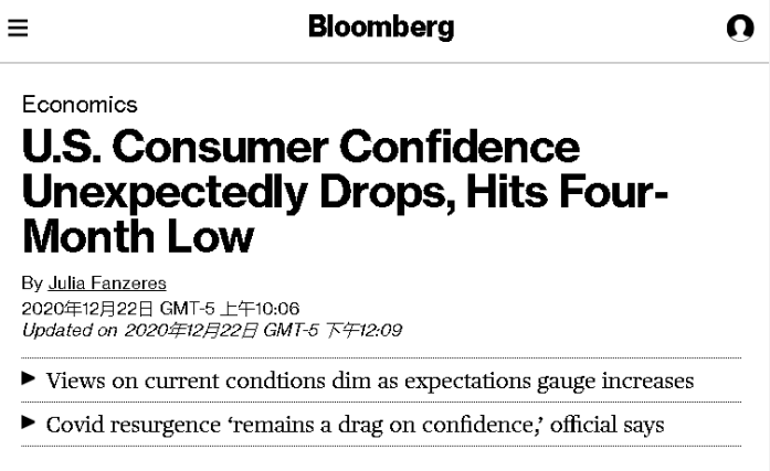 與此同時,世界大型企業研究會22日發佈數據顯示,美國12月消費者信心指數降至88.6,創今年8月以來最低水平,進一步預示着消費導向型的美國經濟前景不容樂觀。為了支持充滿不確定性的經濟復甦,美國國會終於通過了新一輪紓困法案,但卻因為力度有限遭到了廣泛批評。而最新批評紓困法案的,竟是美國總統特朗普,他的表態也引發了外界對他可能不會簽署紓困法案的猜測。