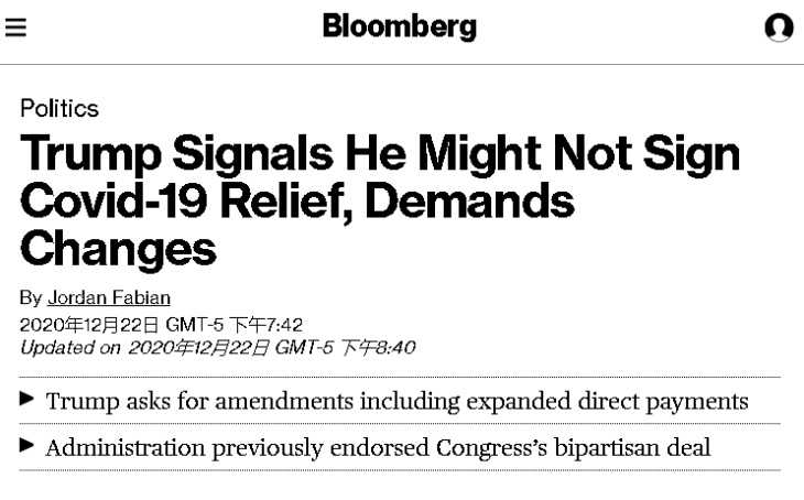 △彭博社稱,特朗普有可能不會簽署紓困法案,呼籲提高紓困力度