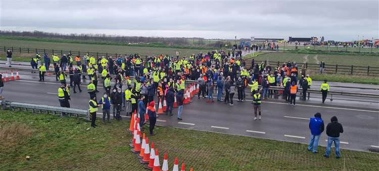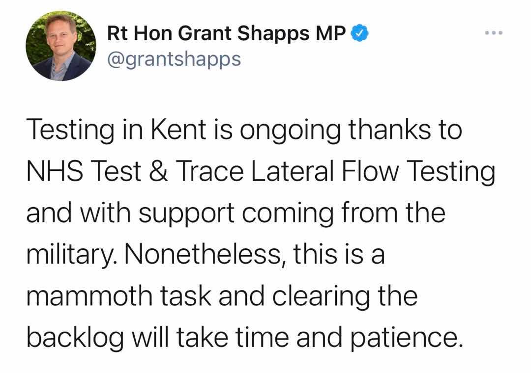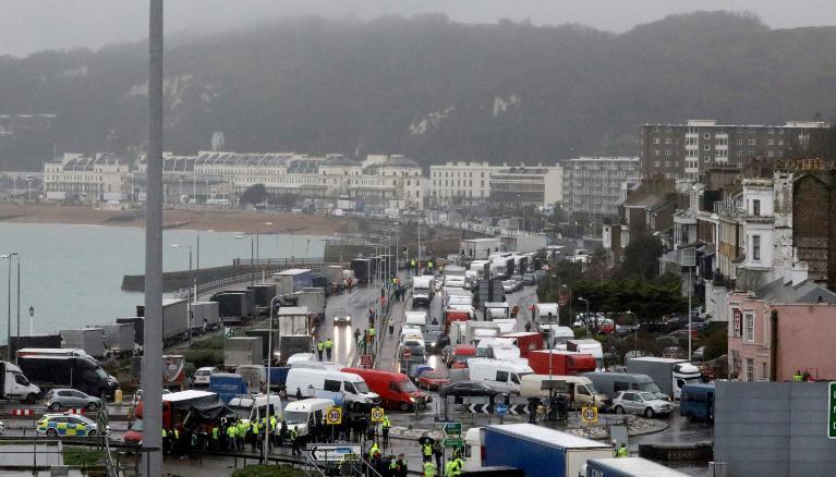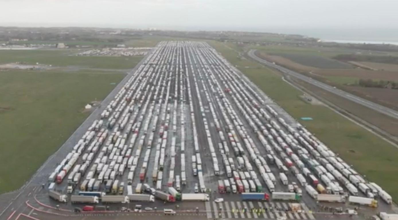 英國住房、社區與地方政府事務大臣羅伯特·詹裏克説,估計至少4000輛貨運卡車滯留在東南部肯特郡。英國公路運輸協會則估計,滯留卡車多至一萬輛。卡車司機們等待從英國多佛前往法國。英國廣播公司(BBC)航拍畫面顯示,公路上的卡車一眼望不到頭。多佛附近的一處廢棄機場成為了3800輛卡車的停車場,還有另外1200輛卡車把多佛附近的公路給佔滿了。