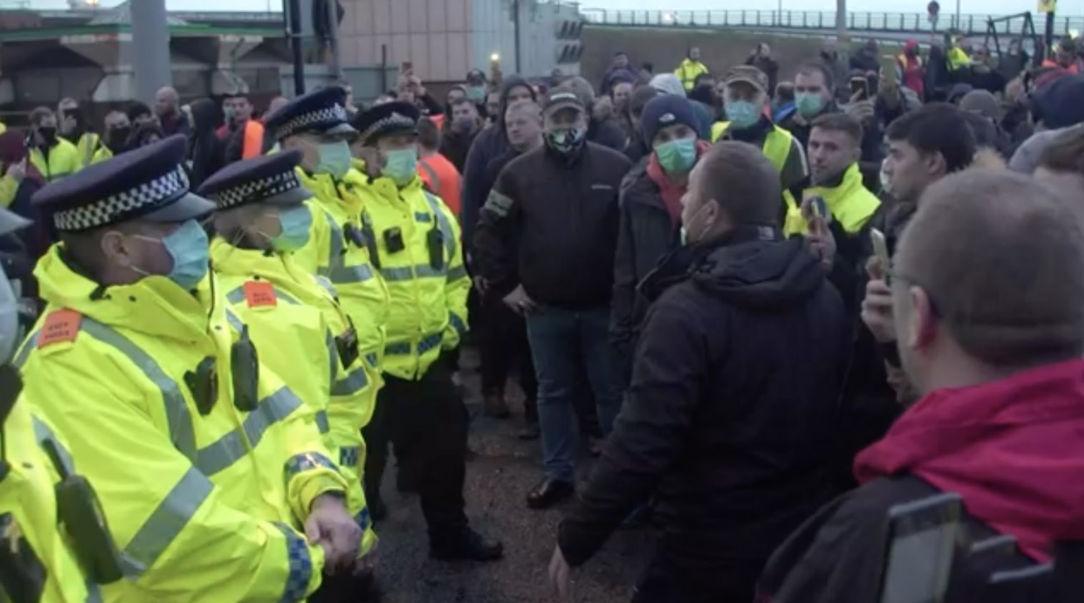 即便如此,卡車司機們仍面臨一個困難:*他們不知道去哪裏檢測。*法國要求所有入境人員提供檢測證明,但英國在一開始並沒有提供足夠的檢測設施。一名來自德國的司機接受路透社採訪説:“我們沒有收到任何消息,大家都變得十分焦慮”。於是,司機開始通過鳴笛和反覆開關車燈的方式抗議,以示不滿。部分情緒激動的司機還在現場舉行抗議活動,甚至與警方發生衝突。警方表示,有一名司機因阻塞道路被逮捕。
