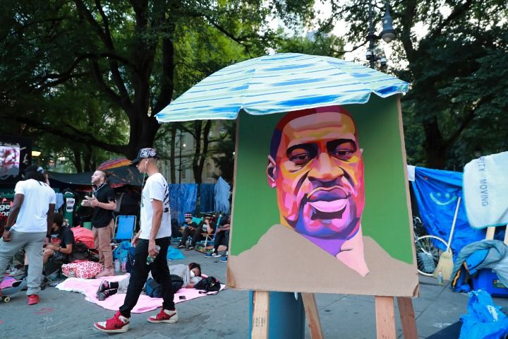 這是6月30日在美國紐約市政廳外“佔領市政廳”抗議活動現場拍攝的弗洛伊德畫像。(新華社記者王迎攝)