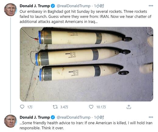 剛剛,特朗普連發兩推斥責道,“我們駐巴格達大使館週日遭遇多枚火箭彈襲擊。三枚火箭彈發射失敗(沒有爆炸)。猜猜它們來自哪兒:伊朗。現在我們聽聞在伊拉克的美國人受到更多攻擊,給伊朗的一些友好健康建議:如果有一個美國人被殺,我都要追究伊朗的責任。好好想想吧。”↓