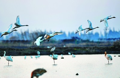 12月21日,天鵝等候鳥在南昌五星白鶴保護小區上空飛翔。新華社發
