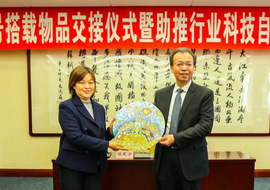 西藏教育廳副廳長鍾吉雲代表西藏自治區政府向探月與航天工程中心轉交西藏小朋友的畫作。探月與航天工程中心 供圖