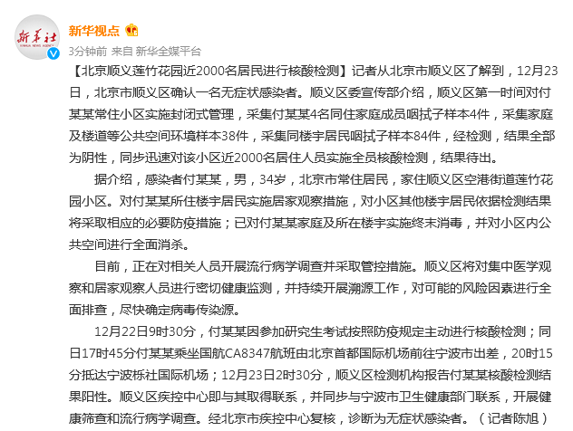 12月22日9時30分,付某某因參加研究生考試按照防疫規定主動進行核酸檢測;同日17時45分付某某乘坐國航CA8347航班由北京首都國際機場前往寧波市出差,20時15分抵達寧波櫟社國際機場;12月23日2時30分,順義區檢測機構報告付某某核酸檢測結果陽性。順義區疾控中心即與其取得聯繫,並同步與寧波市衞生健康部門聯繫,開展健康篩查和流行病學調查。經北京市疾控中心複核,診斷為無症狀感染者。(記者陳旭)