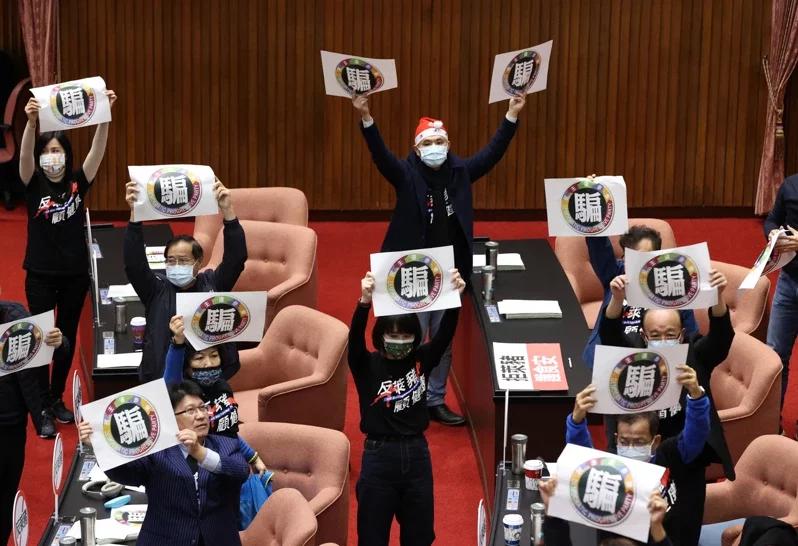 國民黨“立委”24日手持標語要民進黨不要再欺騙民眾。(圖片來源:台灣《聯合報》)